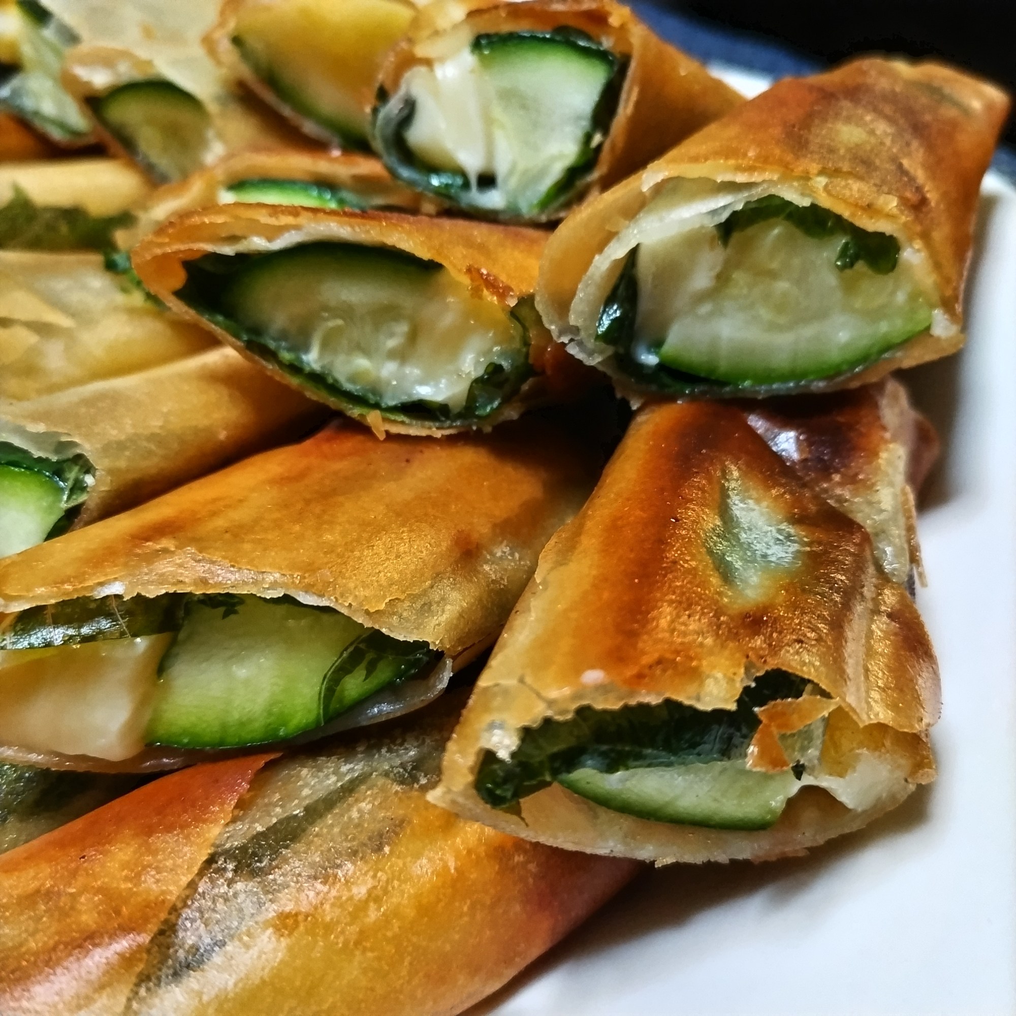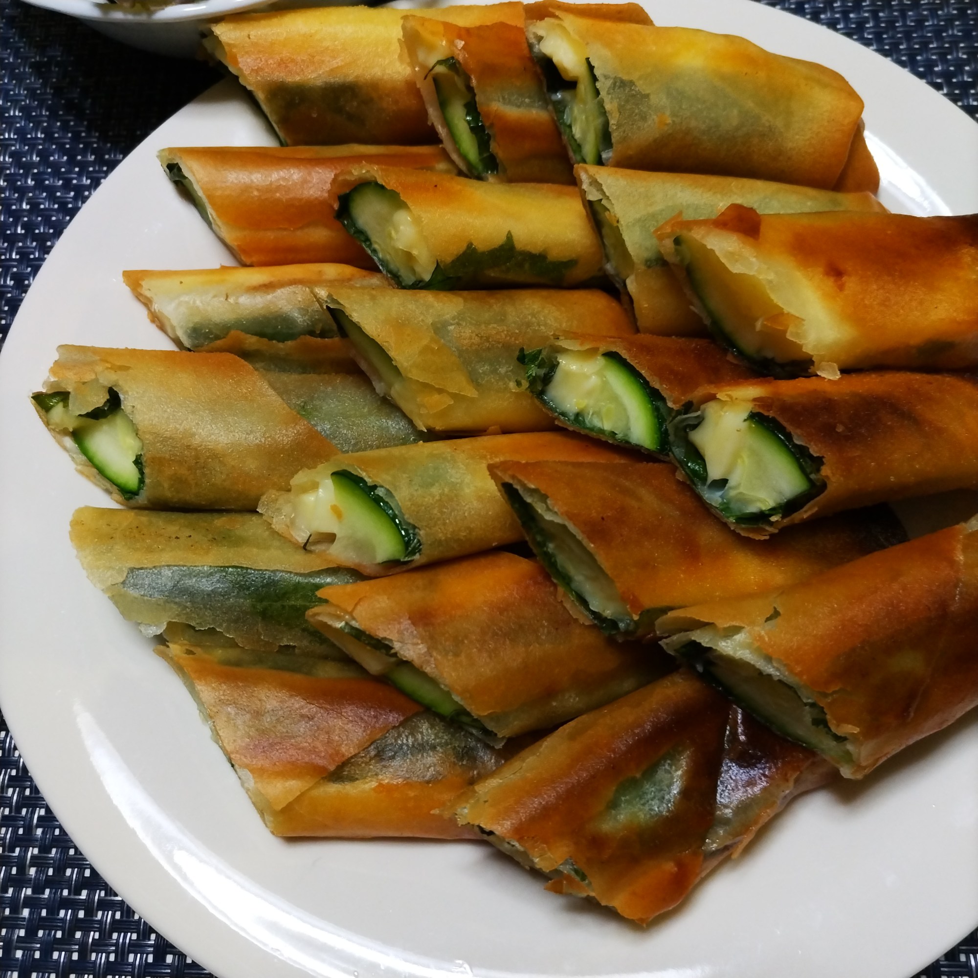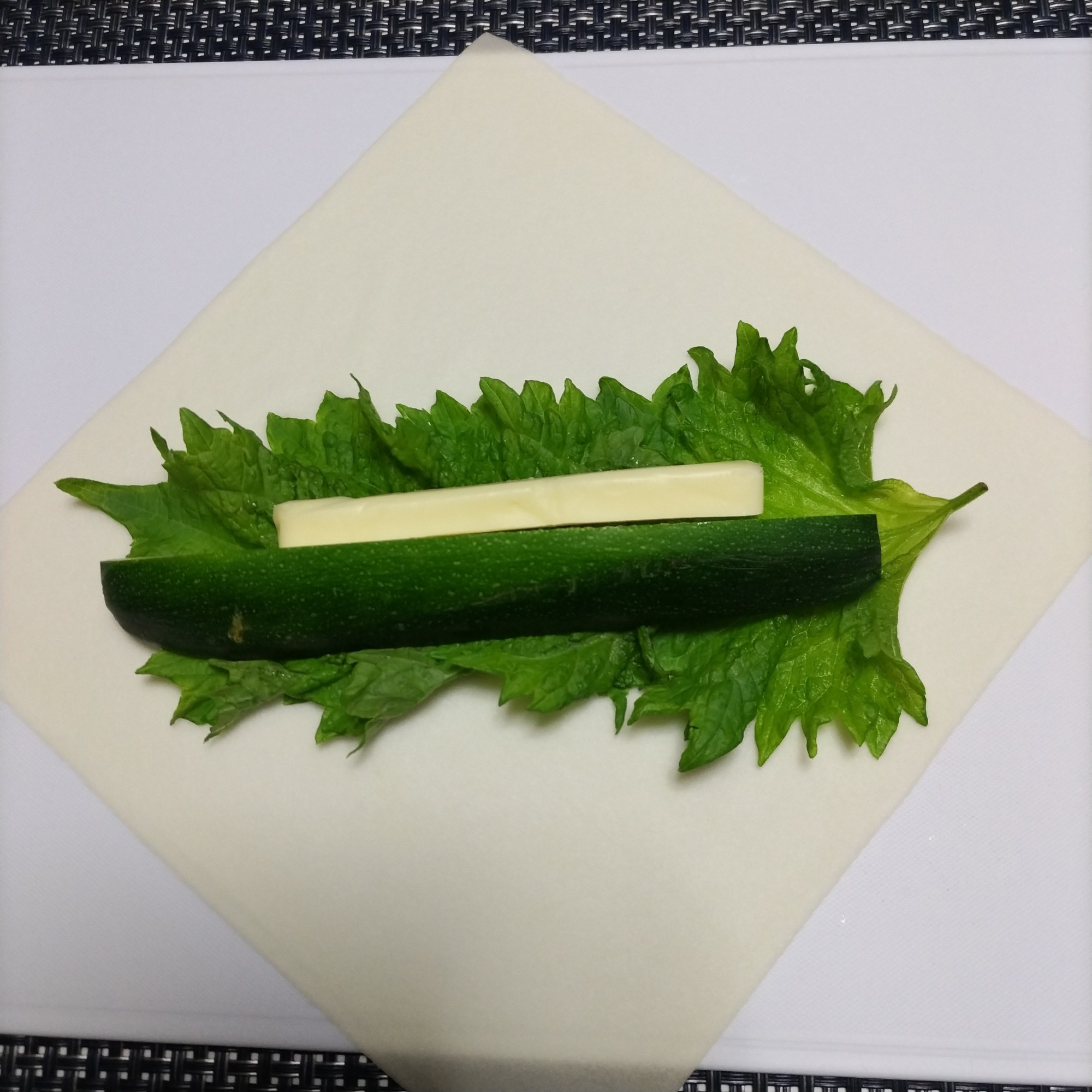 ズッキーニを縦切り6等分に切り、春巻きの皮でくるんで、フライパンで揚げ焼きにします。お好みで、チーズ、青しそを一緒にまいても美味しいです。
