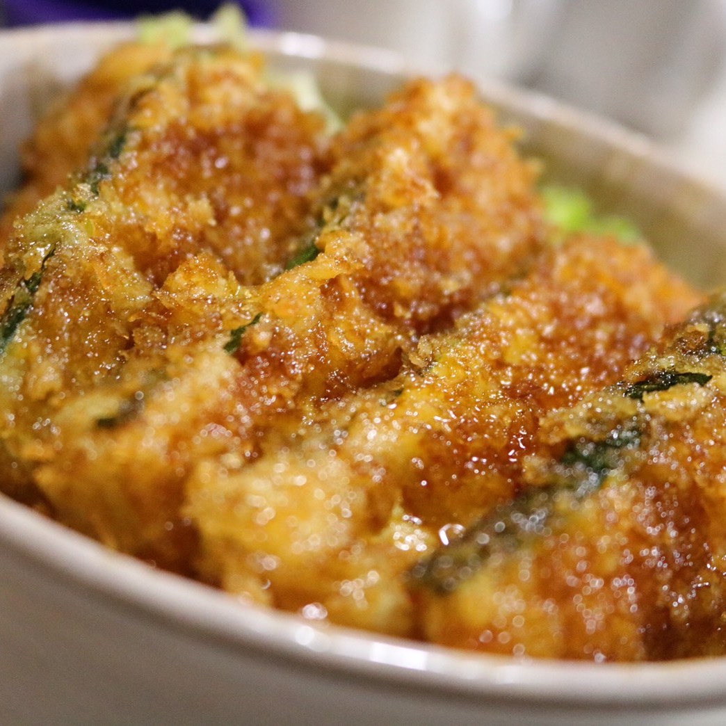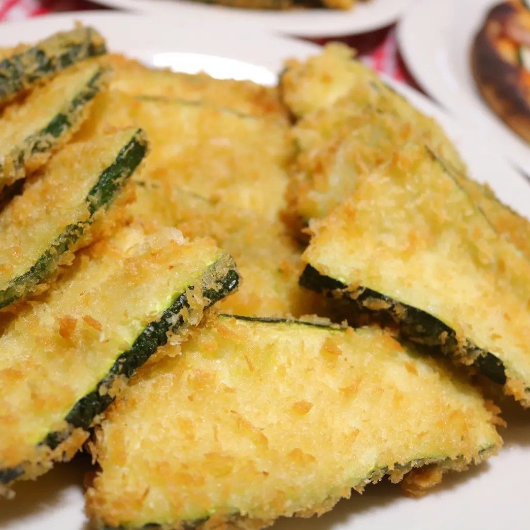 厚さ8mmの縦切りにしたズッキーニを水溶き小麦粉、パン粉をつけてカツにして、たれにつけて、丼にのせます。たれ(4人分)は、しょうゆ1/4カップ、ソース1/4カップ、酒大さじ2杯、みりん1/4カップ、砂糖大さじ2を小鍋に入れ、ひと煮立ちさせれば完成です。サクサク、ジューシー、ご飯が進みます。カツのまま食べてもおいしいですし、ソースにつけたズッキーニカツをパンにはさんだ、ズッキーニカツサンドもおいしいです。