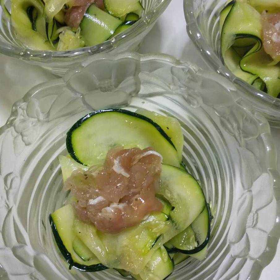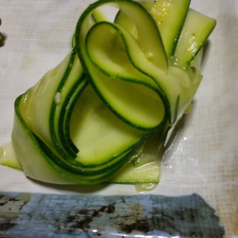 まるごとさっと洗ったズッキーニを、ピーラーでスライス。オリーブオイルと塩、または、ごま油と塩で和えれば、あっというまにズッキーニカルパッチョのできあがりです。