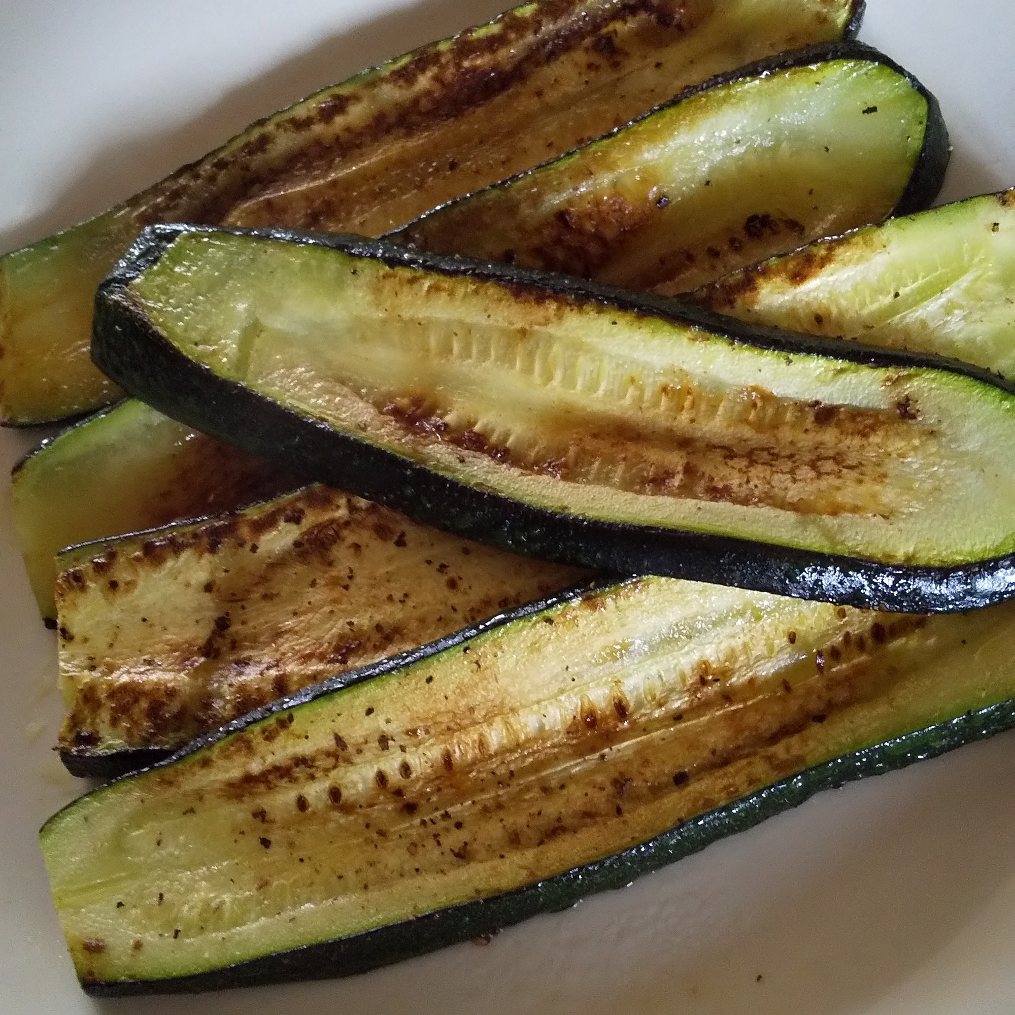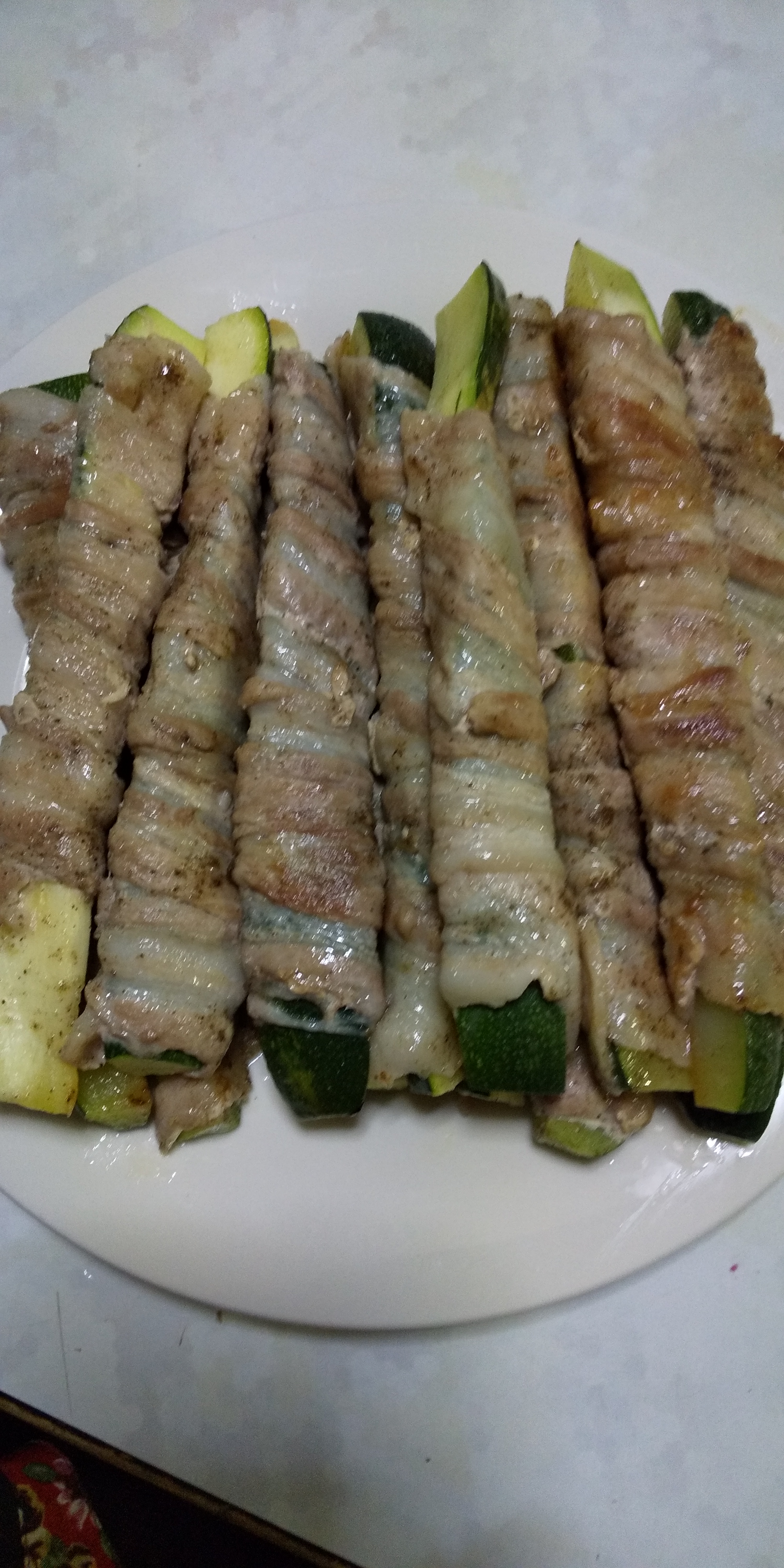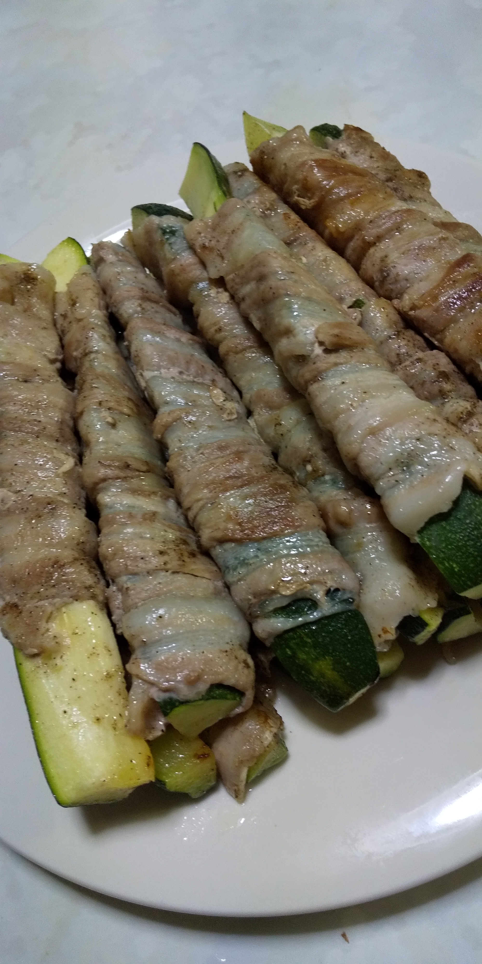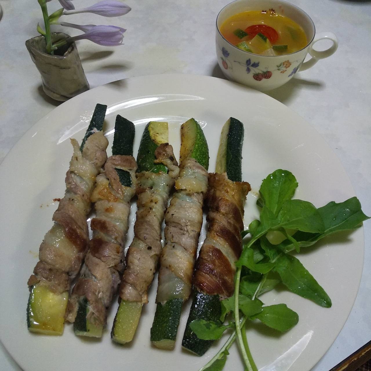ズッキーニを縦切り6等分に切り、豚バラ薄切り肉をまいて、塩こしょうをふり、フライパンで焼きます。フライにしてもおいしいです。