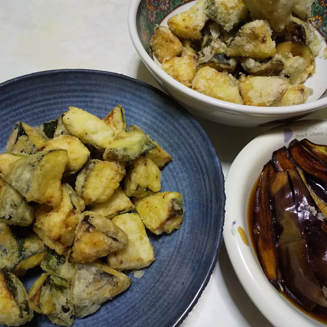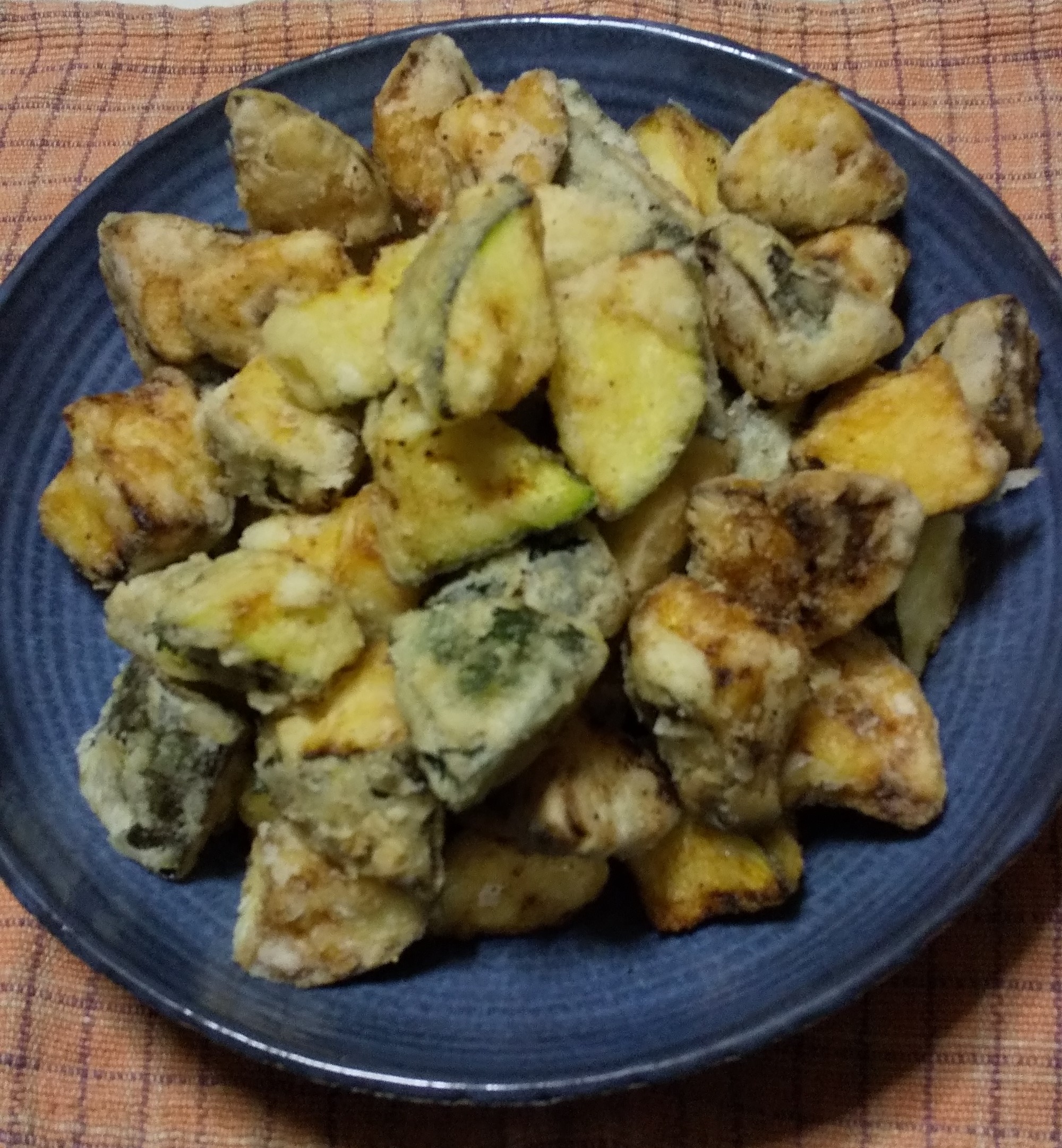 ズッキーニを乱切り切りにして、塩、すりおろしたしょうがでもみます。長く置くと水分が出てしまうので、すぐに片栗粉をつけて揚げます。しょうゆとすりおろしたしょうが、砂糖でもんであげるのも美味しいです。