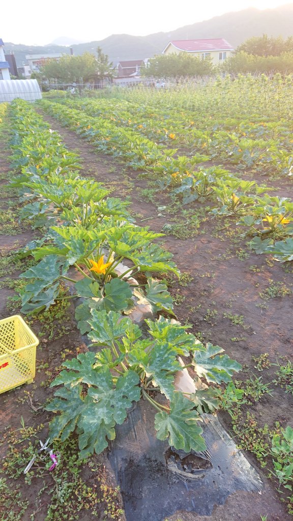 毎朝、日の出と共に畑に出て、ズッキーニの収穫から一日が始まります。