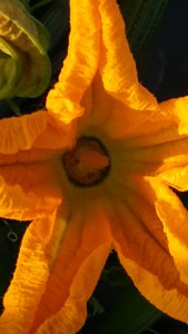 ズッキーニの花は雌花♀と雄花♂が別になっていて、雄花から出た花粉を雌花が受け取ることによってやがて種ができます。